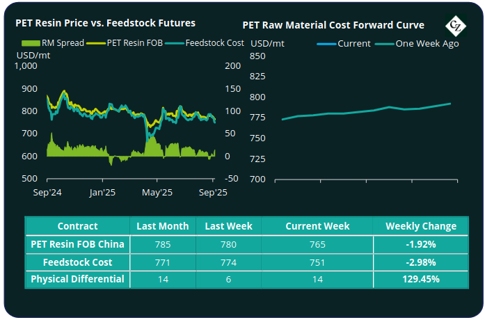 The average weekly premium of the Sept’25 PET Futures over Sept’25 Raw Material futures rebounded after last week’s sharp decline to USD 46/tonne, up USD 8/tonne. By Friday, the daily premium had collapsed back to USD 37/tonne.