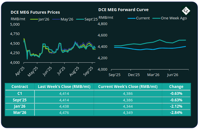 The MEG Futures forward curve kept flattened, losing all previous forward premium, with Jan’26 now holding a RMB 42/tonne discount over the current month, and Mar’26 holding a RMB 37/tonne discount.