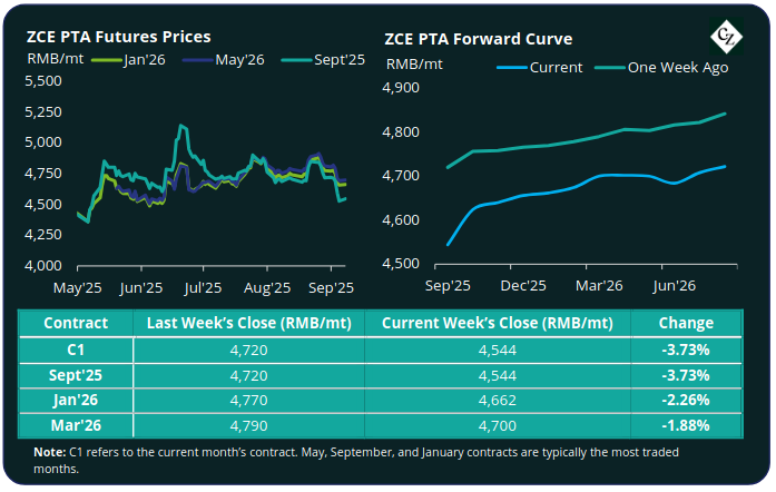 The PTA forward curve has gradually steepened in contango. The Jan’26 contract has a RMB 118/tonne premium to the current month’s contract, and Mar’26 holds a RMB 156/tonne premium.