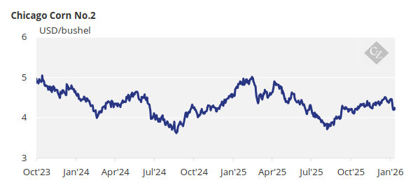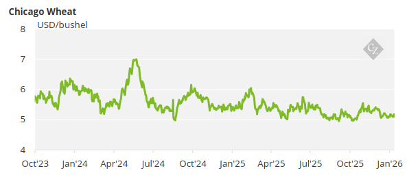 The USDA surprised markets with record corn output. Corn plunged in Chicago while wheat traded flat, with record Argentine wheat production reinforcing the bearish tone. With the WASDE report now digested, focus should shift to geopolitical risks, while ample supply caps prices and keeps Chicago corn in a USD 4.3–4.5/bushel range through Q1.