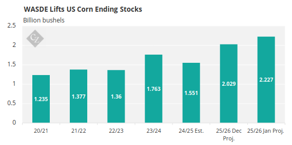 On the wheat side, the January WASDE increased US ending stocks by 25 million bushels, all coming from lower demand, as production was left unchanged at 1.985 billion bushels.