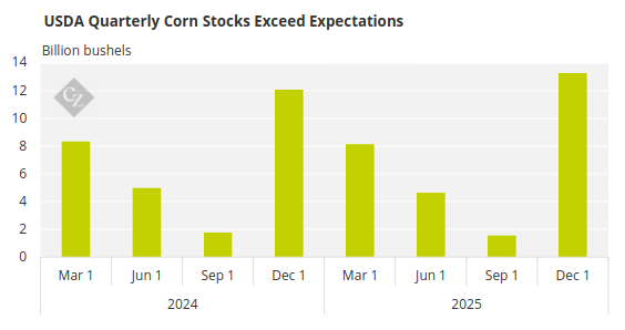 The USDA also published its quarterly stocks report last Monday, which was also bearish. Corn stocks as of December 1 came in at 13.3 billion bushels, up from 12.07 billion bushels last year and above the 12.96 billion bushels expected by the market.