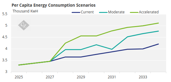 The moderate scenario projects gradual growth, with per capita consumption reaching 4,778 kWh per year in 2034 and 5,275 kWh per year in 2052, aligning with international standards. By 2034, projected growth would be nearly 50%.