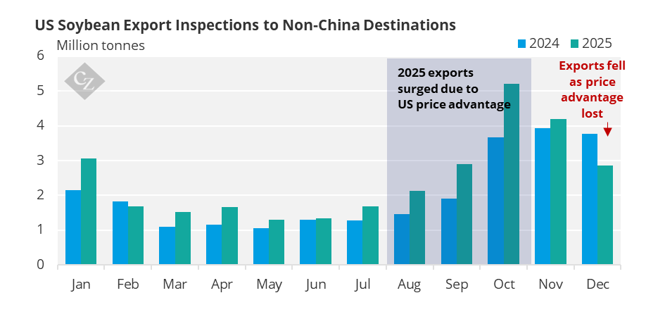 Moreover, news of Chinese purchases drove up US FOB prices, undermining US price competitiveness. The surge in US exports to non-China destinations seen in the autumn months was reversed in December as inspections of beans bound for non-China destinations dropped.