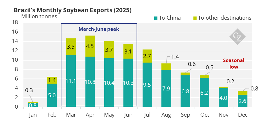 China’s soybean imports set monthly records from May through November, despite importing negligible amounts of soybeans from the US during those months. China’s imports through November reached 103.8 million tonnes (74% from Brazil) and are expected to exceed 110 million tonnes for calendar year 2025. China still had unusually low prices and high inventories of soybeans and soybean meal in December.