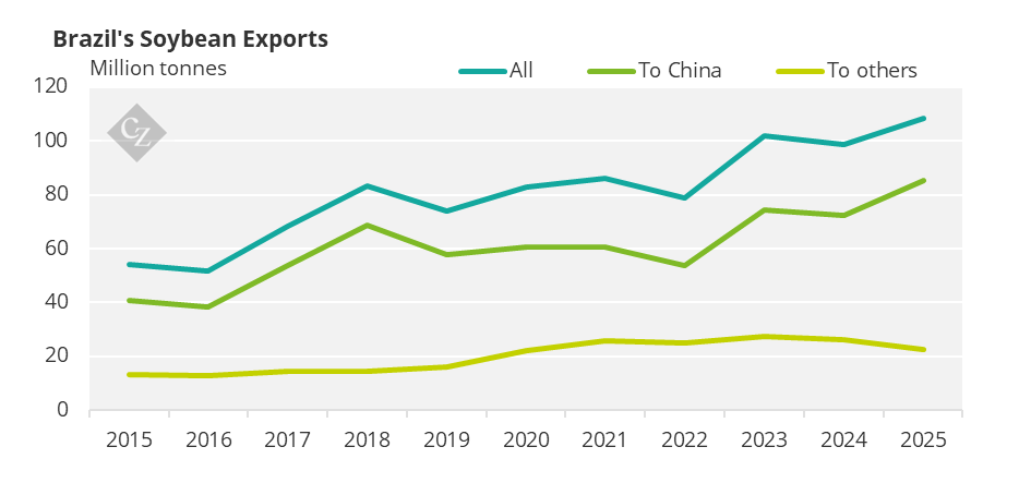 Brazil’s record exports were instrumental in facilitating China’s ability to maintain high tariffs on US soybeans after the trade war heated up during 2025. Exports bound for China totalled 85.4 million tonnes, accounting for 79% of Brazil’s soybean exports. Brazil’s exports to China rose 12.9 million tonnes during 2025, while its exports to non-China destinations fell 3.5 million tonnes.