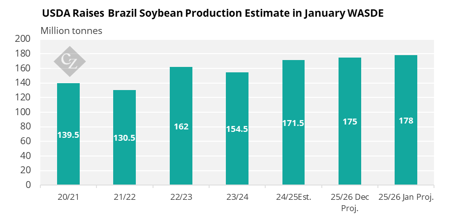 Larger Brazilian exports will resume in 2026 after another large Brazilian soybean crop is harvested. Brazil’s CONAB estimates production at 177 million tonnes. In January’s WASDE report, the USDA raised its estimate to 178 million tonnes. Other analysts projected amounts larger than last year’s 171.5 million.
