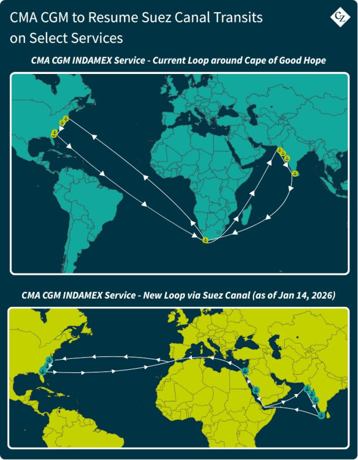 French container giant CMA CGM made the first move in early December by announcing that its INDAMEX service will transit the Suez Canal on both fronthaul and backhaul voyages between India/Pakistan and the US East Coast. CMA CGM had previously attempted to reintroduce the restricted areas into its services, but developments at the time did not allow these attempts to continue.
