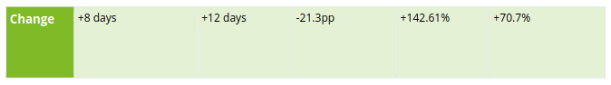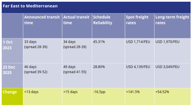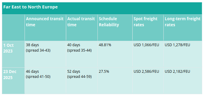 The following table shows that transit times on fronthaul services to Europe remain significantly extended, schedule reliability is much lower, and both spot and long-term freight rates still have room to fall before returning to October 2023 levels, which represent the pre–Red Sea crisis period.