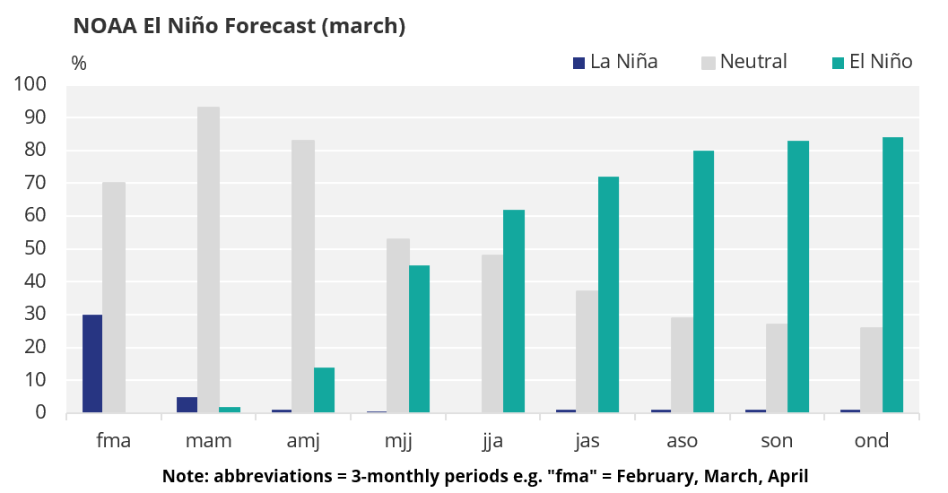 Projections now indicate that any EL Nino event may reach a strong intensity at the end of 2026. Some climate models, such as the ECMWF (European Centre for Medium-Range Weather Forecasts) do not rule out an even more intense scenario, although this can only be predicted with greater precision from July onwards. In the current scenario, the main indication is of an event closer to the 2023 El Niño.