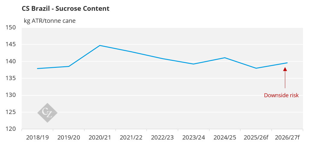 Thus, there is a downside risk in our current ATR forecast for the 2026/27 cane harvest, which is currently 139 kg/tonne and, consequently, for CS sugar production. According to our models, for every 1 kilogram of ATR lost, at least 300 thousand tonnes of sugar would not be produced.