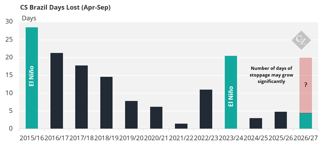 In 2023, when we had the last El Niño of strong intensity, 20 crushing days were lost between April and September. The industry can crush 3 million tonnes of cane per day in the peak of the harvest.