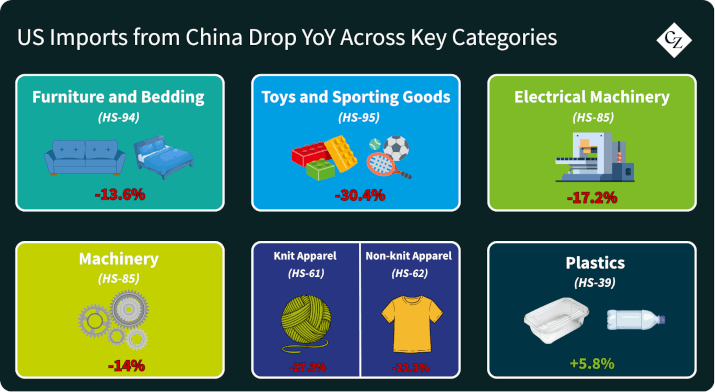 According to Descartes Datamyne, year-over-year declines were broad across China’s major import categories in October, with most key product groups recording double-digit losses.