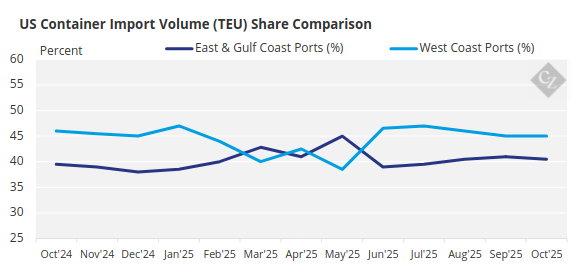 Looking more closely, West Coast ports maintained a larger share than East & Gulf Coast ports throughout the year, except in March and May. The West Coast began the year at roughly 48%, dropped sharply to around 40% in March, and after some fluctuations, stabilised above 44% from June through October.