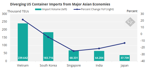 In October, US import performance among major Asian economies was mixed. Imports from Vietnam saw strong growth, while South Korea experienced a slight decline. Imports from Singapore, India and Japan all fell, with Singapore and India facing the steepest drops.