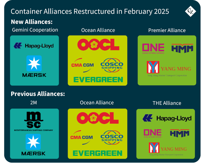 In February 2025, the global container shipping alliances underwent a major restructuring. The new framework consists of three groups: Gemini Cooperation, a newly formed partnership; Premium Alliance, a restructured group following the departure of Hapag-Lloyd; and Ocean Alliance, which remained unchanged.