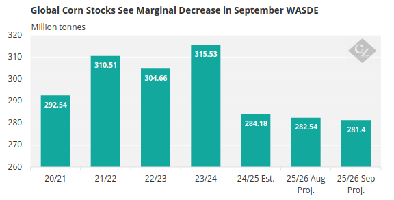 Corn has rallied on the WASDE yield cut despite higher stocks. US wheat stocks fell while global stocks rose, and Brazil raised corn output again. With September futures having expired, markets may correct as the cut to corn ending stocks was small, acreage revisions face scrutiny, and harvest pressure builds.
