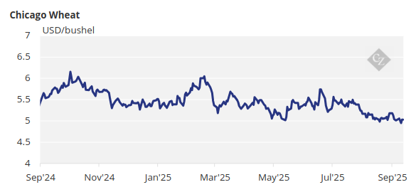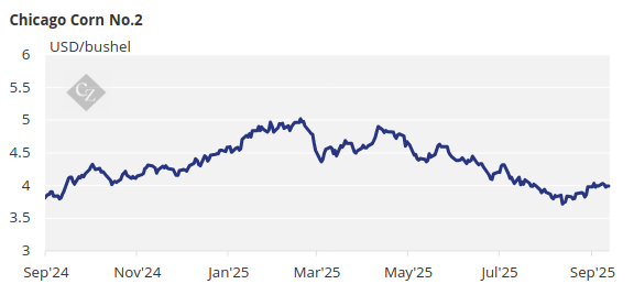 The average price of Chicago corn for the 2024/25 crop (September/August) closed at USD 4.37/bushel. Our estimate for the 2025/26 crop is for Chicago corn to average USD 4.18/bushel. The average price since September 1 is running at USD 4.03/bushel.