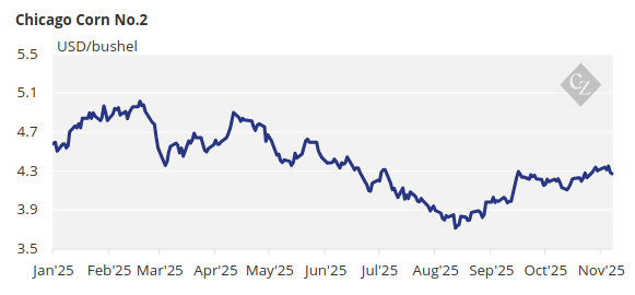 There are no changes to our estimate for Chicago corn to average USD 4.18/bushel during the 2025/26 (September/August) crop year. The average price since September 1 is running at USD 4.20/bushel.
