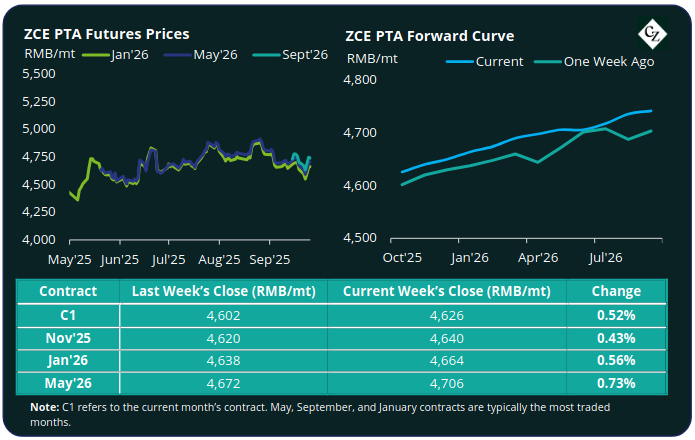 The PTA forward curve premium has remained relatively stable over the last week; the Nov’25 contract has a RMB 14/tonne premium to the current month’s contract, and Jan’26 with a RMB 38/tonne premium.