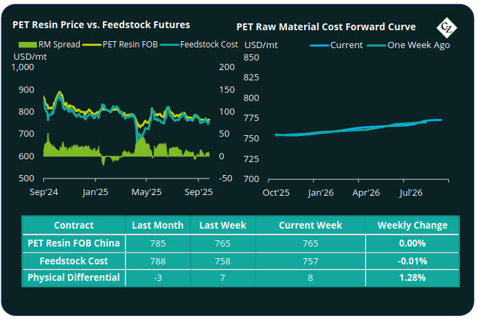 The average weekly premium of the Nov’25 PET Futures over Nov’25 Raw Material Futures moved slightly higher to USD 60/tonne, up USD 1/tonne. By Friday, the daily premium was USD 61/tonne.