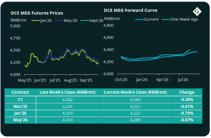 The MEG Futures forward curve broadly kept shape, although the current month softened marginally versus forward main months; Nov’25 holding a RMB 48/tonne discount over the current month, and Jan’26 holding a RMB 42/tonne discount.