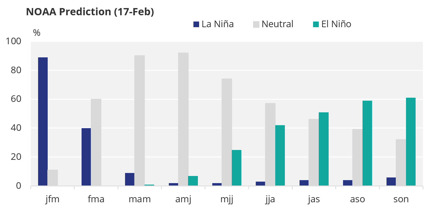 The most recent projections from the National Oceanic and Atmospheric Administration (NOAA) already point to a higher probability of the formation of an El Niño of moderate to strong intensity, similar to that observed in 2023. They believe the phenomenon could start in May, with intensification throughout the Aug/Sept/Oct quarter. Historically, the peak occurs between November and January, the summer of the Southern Hemisphere.