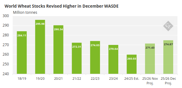 The December WASDE surprised grains markets with mixed signals. Corn rose in Chicago while wheat fell, with European grains also declining. Global wheat production reached an all-time high of 837.8 million tonnes, up 37 million tonnes year on year, boosting world stocks and weighing on prices.