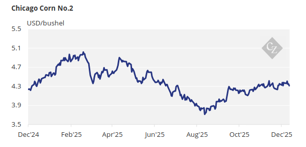 There are no changes to our estimate for Chicago corn, which is expected to average USD 4.18/bushel during the 2025/26 (September/August) crop, with some upside bias. The average price since September 1 is running at USD 4.24/bushel.