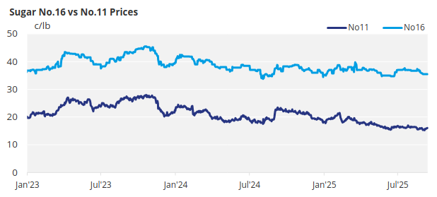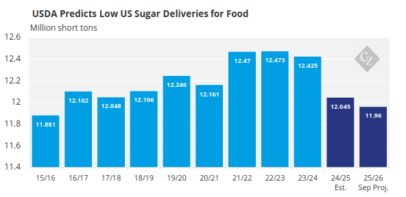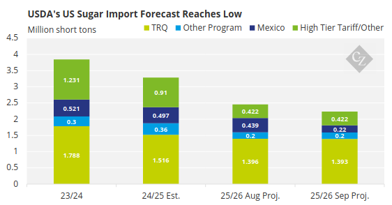 Even with high tariffs and an import forecast for 2025-26 at the lowest in almost two decades (per the USDA), supply is not an issue. Mexico is taking the brunt of the drop in US imports, while high-tier imports will continue, though at a slower pace than in 2024-25. Domestic beet and cane supplies are ample, with new-crop harvests expected to add to supplies later in October.