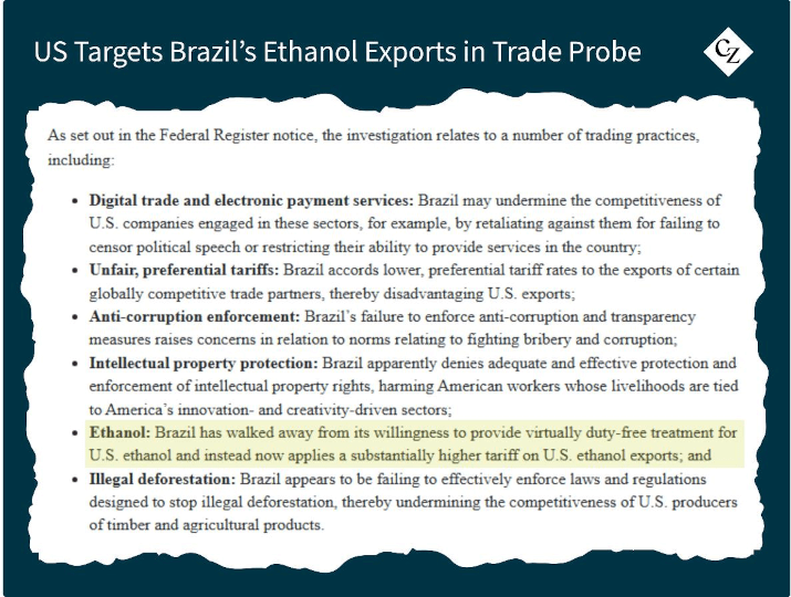 Industry groups also pointed to the US’ lack of access to Brazil’s low-carbon fuel regulation, RenovaBio, and alleged “false sustainability” claims that have made Brazilian ethanol more competitive in export markets. Since August, the US has imposed a 50% tariff on all Brazilian imports.