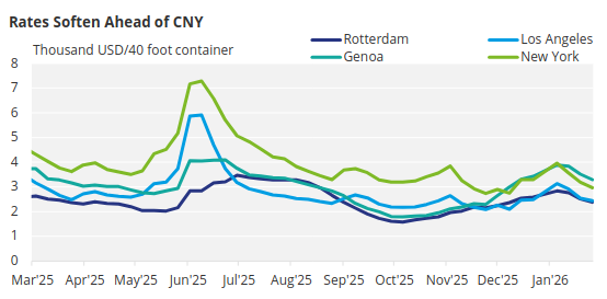 According to Xeneta, the pre–Lunar New Year cargo rush has largely passed. As a result, market dynamics are increasingly shifting in favour of shippers rather than ocean carriers, with further downward pressure on freight rates.
