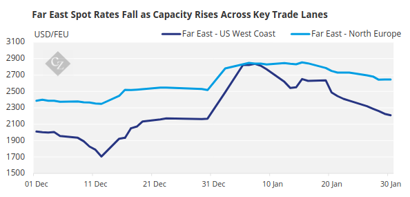 Below are some interesting Xeneta data points on daily spot rates and weekly capacity trends across major trade lanes through the end of January.