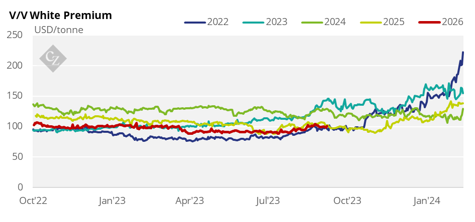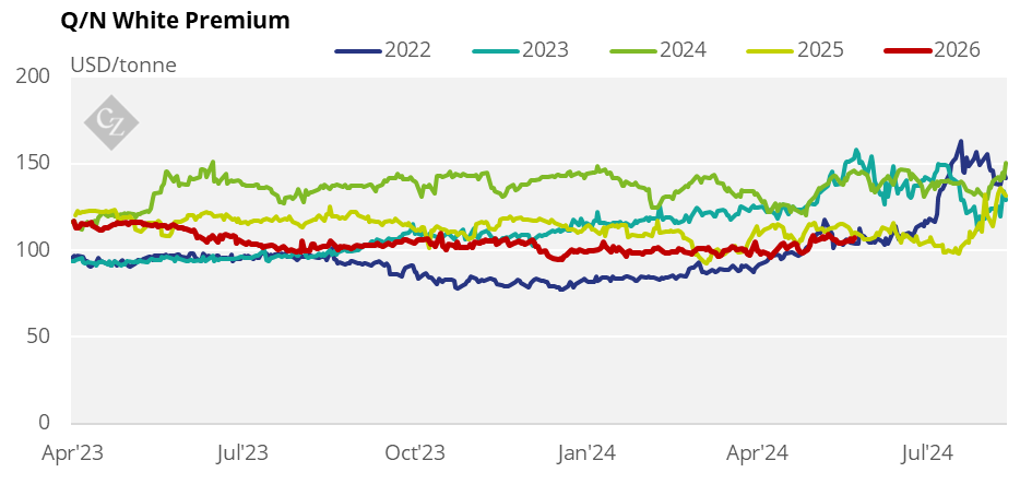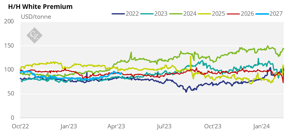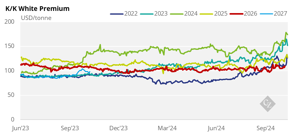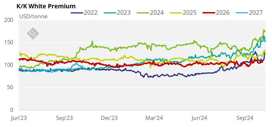 The K/K white premium traded at USD 105.7/tonne at the start of the week and closed at USD 109.2/tonne on Friday.