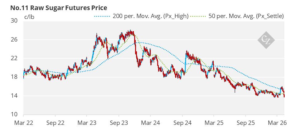 The raw sugar futures prices continued to trade lower, starting the week at 15c/lb and eventually declining to 13.8c/lb by Friday’s close.