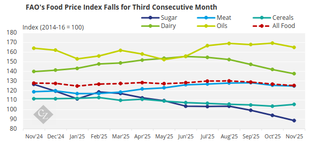 The FAO Food Price Index, which tracks monthly changes in international prices for a basket of globally traded food commodities, averaged 125.1 points in November—down 1.2% from October. The index now stands 2.1% below its November 2024 level and 21.9% lower than its peak in March 2022.