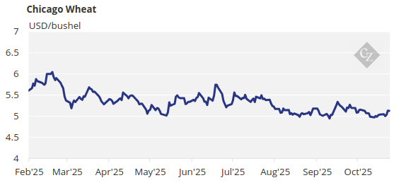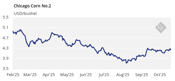 There are no changes to our estimate for Chicago corn to average USD 4.18/bushel during the 2025/26 (September/August) crop year. The average price since September 1 is running at USD 4.17/bushel.