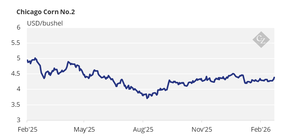 There are no changes to our estimate for Chicago corn to average USD 4.18/bushel during the 2025/26 (September/August) crop year, with some upside bias. The average price since September 1 is running at USD 4.28/bushel.