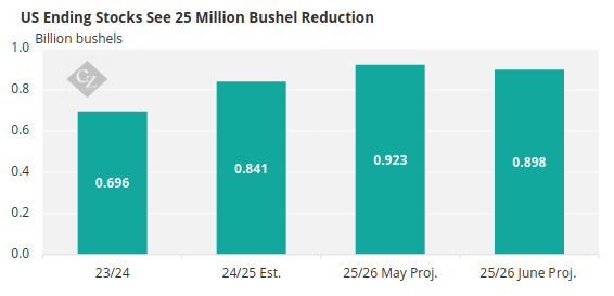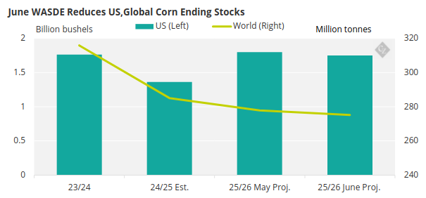The June WASDE report reduced US corn ending stocks of the old crop by 100 million bushels, all coming from higher exports. There was no increase in corn demand for ethanol, as we were expecting. New crop ending stocks were reduced by the same 100 million bushels, all coming from the higher exports of the old crop. Old crop stock-to-use is tight at 8.9%, while the new crop is expected to be 11.3%. Global stocks were reduced by 2.6 million tonnes, all due to higher demand.