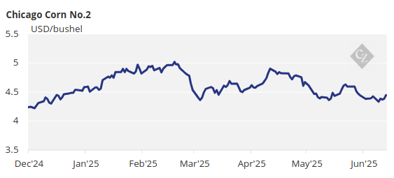 There is no change to our forecast for Chicago corn for the 2024/25 crop (September/August), which is expected to average USD 4.55/bushel, with some downside risk depending on the trade war. The average price since September 1 is running at USD 4.47/bushel.