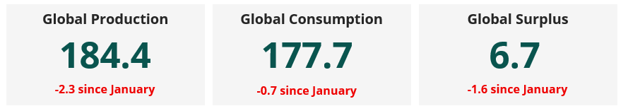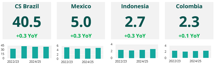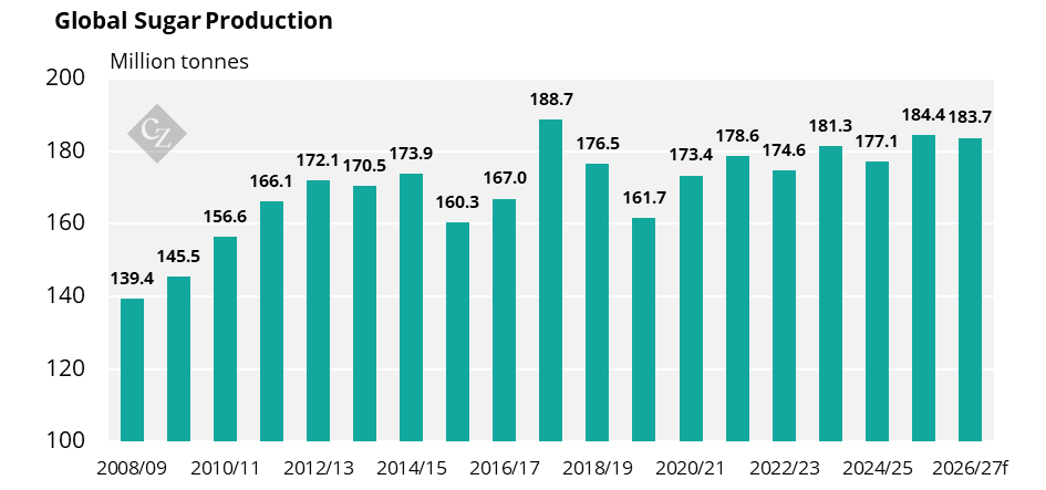 Our estimate for global sugar production is down by 2.3 million tonnes since our last report. We now think that global sugar production will hit 184.4 million tonnes in 2025/26.