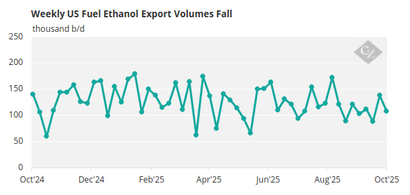 According to the October 7 Short-Term Energy Outlook from the US Energy Information Administration (EIA), forecasts for 2025 and 2026 fuel ethanol blending and exports were unchanged from the previous report. Fuel ethanol production also remained unchanged.