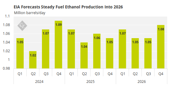 On a quarterly basis, the EIA currently expects fuel ethanol production to average 1.05 million barrels per day during the fourth quarter of 2025. In 2026, production is forecast to average 1.05 million barrels per day in the first quarter, 1.07 million barrels per day in the second quarter, 1.05 million barrels per day in the third quarter, and 1.08 million barrels per day in the fourth quarter.