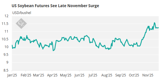 China resumed US soybean purchases in November. Rising Brazilian prices narrowed the US price gap, but a 10% tariff keeps US soybeans uncompetitive for most Chinese buyers. Shrinking South American supplies may create a brief window for US exports to rebound in early 2026.