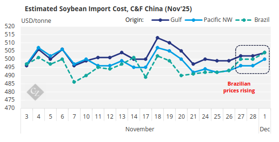 Despite these price movements, the difference between Brazilian and US soybean prices was still less than 1% by late November, not large enough to offset the extra 10% tariff on US soybeans. A Chinese oilseed market report estimated the after-tax import cost in Chinese currency at RMB 4,465/tonne for US soybeans and RMB 4,002 for Brazilian soybeans imported in January 2026.