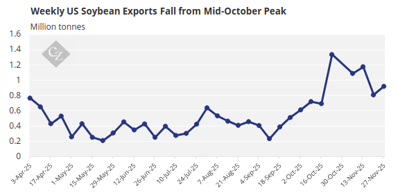 Weekly USDA export inspections for the 2025/26 market year fell below 800,000 tonnes during the week ending November 20, about half the nearly 1.6-million-tonne peak during the week ending October 16 when US beans were still at a discount to Brazilian beans.