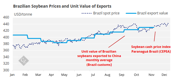 The recent movement in Brazilian prices is the latest in a rising trend since Brazil’s soybean harvest in early 2025. The average value of Brazil’s exported soybeans reported by customs data edged upward from about USD 380/tonne to USD 430/tonne between April and October, a cumulative increase of 13% over six months. A rise in fob price quotes at the Paranagua port parallels the increase in export value. In November, Paranaguá prices rose above USD 440/tonne for the first time in 2025.