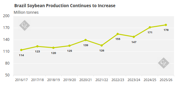 Another record Brazilian soybean crop is expected to be harvested in early 2026, limiting room for further growth in Brazilian prices. The availability of large Brazilian supplies in the months after the new harvest will likely put downward pressure on prices in 2026, leaving a brief window for US exports to rebound in Q1 2026.