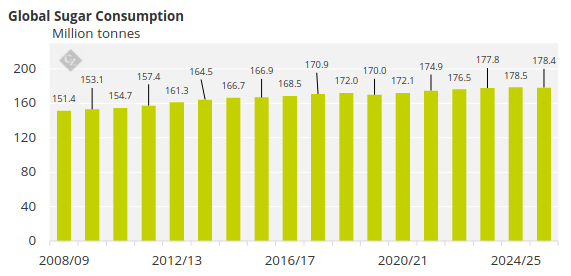 For decades, global sugar consumption has only risen. Its growth has been propelled by the vast increase in the world’s population and increasing wealth/urbanization, which favours packaged food consumption.