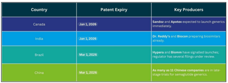 Patent protections for semaglutide (Ozempic/Wegovy) expire in 2026 in Canada, India, Brazil and China, opening the door for lower-cost biosimilar generic versions. We have seen reports that these generic versions may cost as little as USD 10 per dose to make. Analysts expect steep price reductions in countries where the patent expires — potentially slashing costs by 60–70% once generics enter the market.
